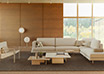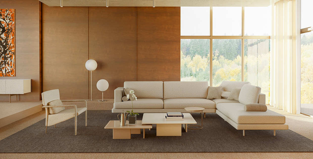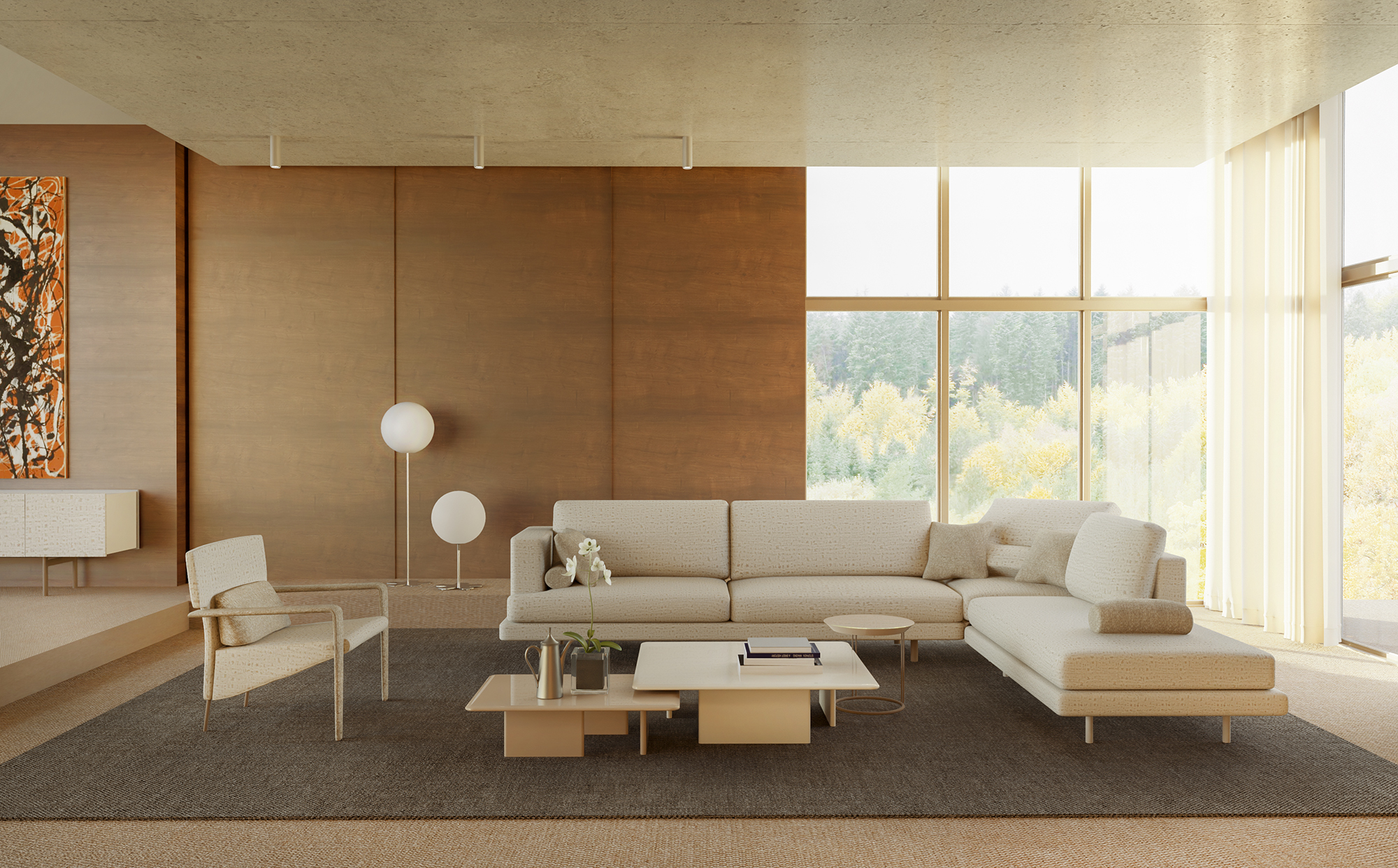 Struttura metallica portante incorporata totalmente nell'imbottitura in gomma uretanica indeformabile. Cuscini schienale lineari con possibilità di inserti. La serie comprende: poltrona, divani a due e tre posti, divani angolari, chaise longue e pouff.