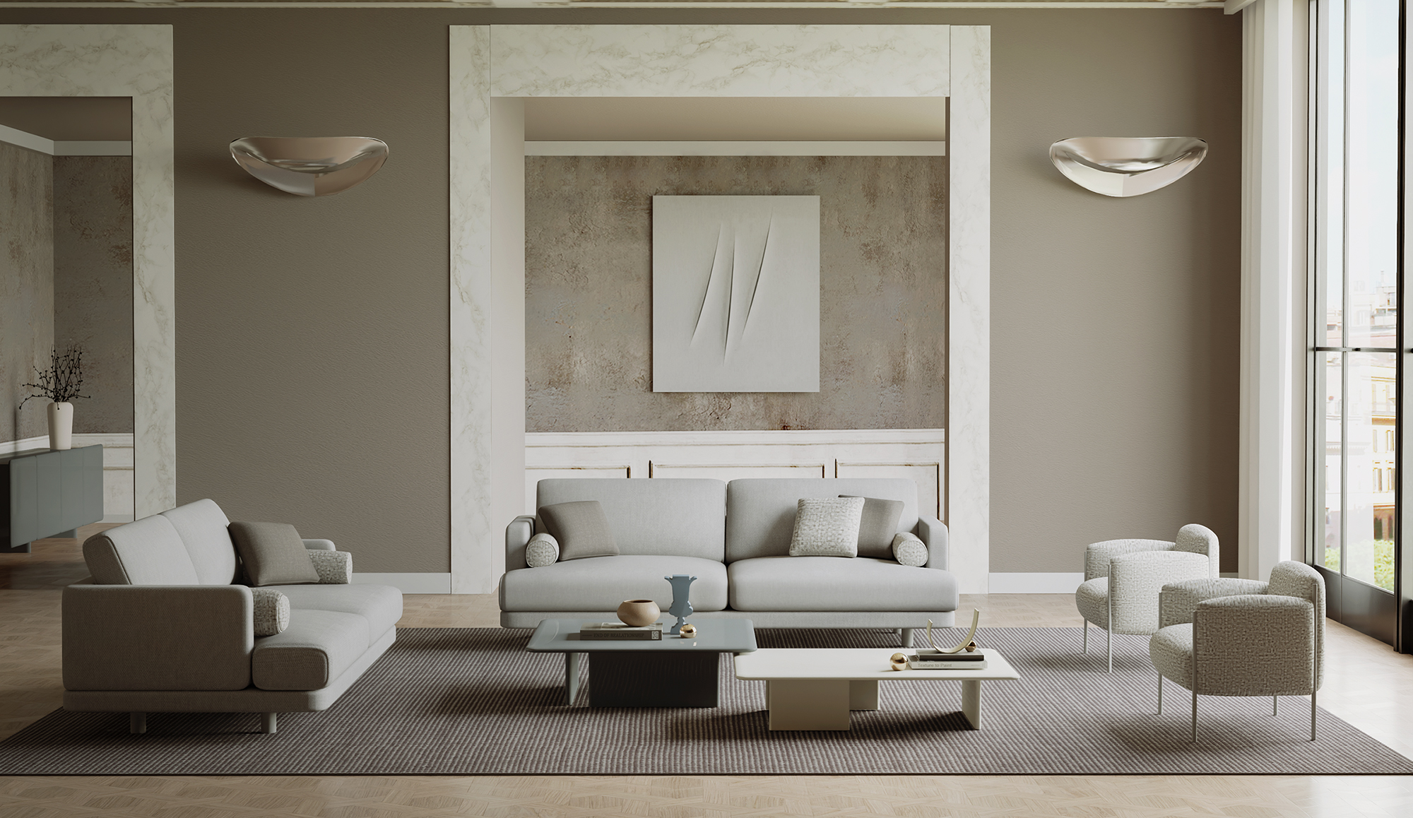 Divano con struttura metallica portante incorporata totalmente nell'imbottitura in gomma uretanica indeformabile. Cuscini di seduta e di schienali completamente in piuma. I cuscini hanno sempre un profilo in pelle. La serie comprende poltrone, divani lineari ed angolari con chaise longue, pouff, tavolini imbottiti.
