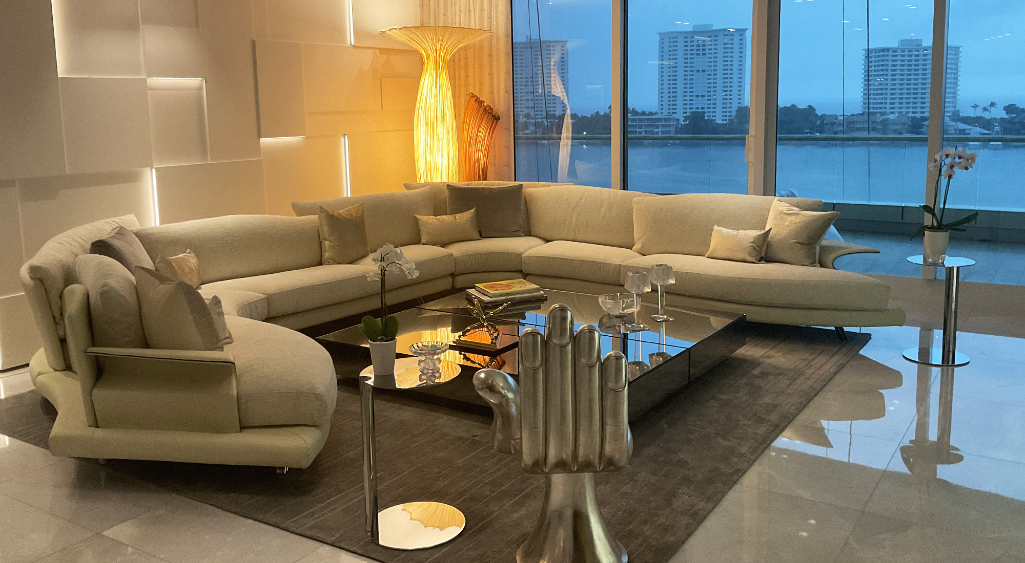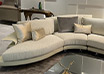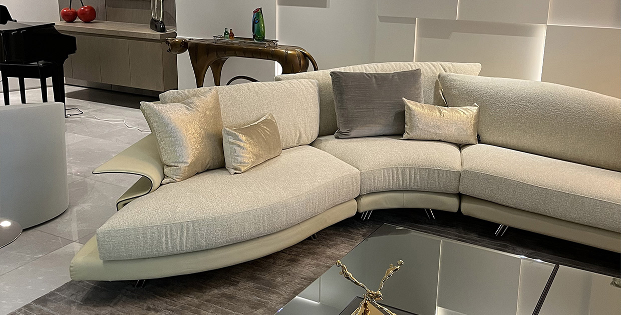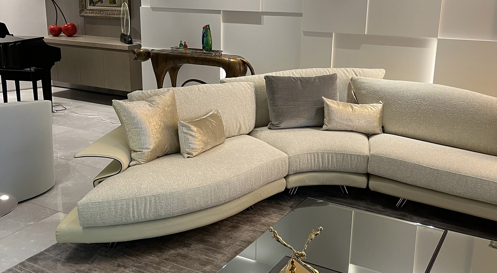 Composizioni e misure a richiesta con l'aggiunta di una chaise longue sagomata. Struttura metallica imbottita in gomma uretanica indeformabile. Schienali curvi sovrapposti, a due profondità differenziate per un diverso comfort di seduta. Il taglio in diagonale dei cuscini di seduta si raccorda con la particolare forma dei cuscini degli schienali.